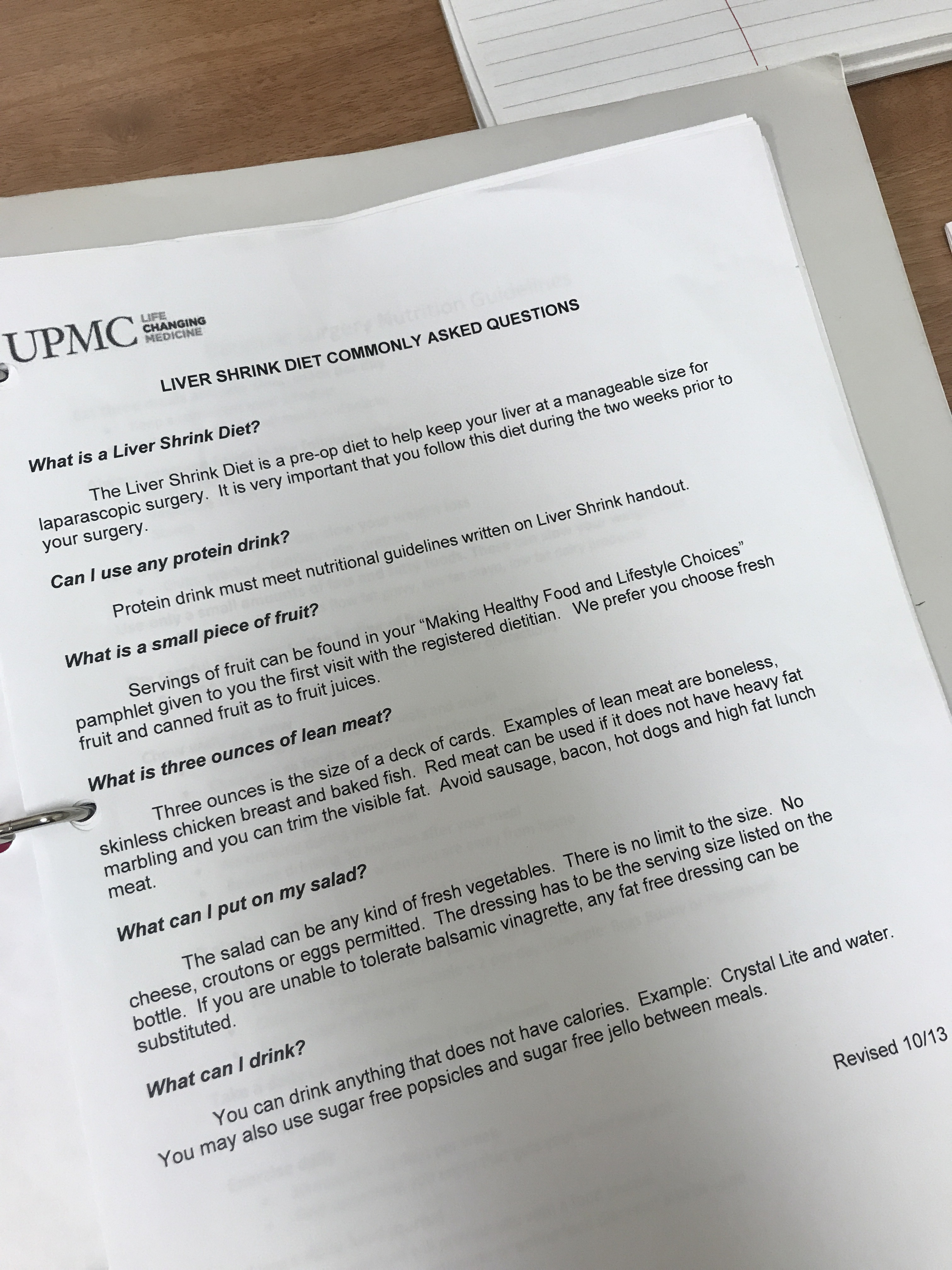 This will be one of the hardest things i have to do for this surgery but I know it is to prepare my body for surgery. By following this diet my liver will shrink and the Doctor will be able to maneuver inside of my while doing the surgery laparoscopicly. If i do not follow this diet there is the chance that they would have to open me up completely to perform the surgery and I will do whatever i can to avoid that.