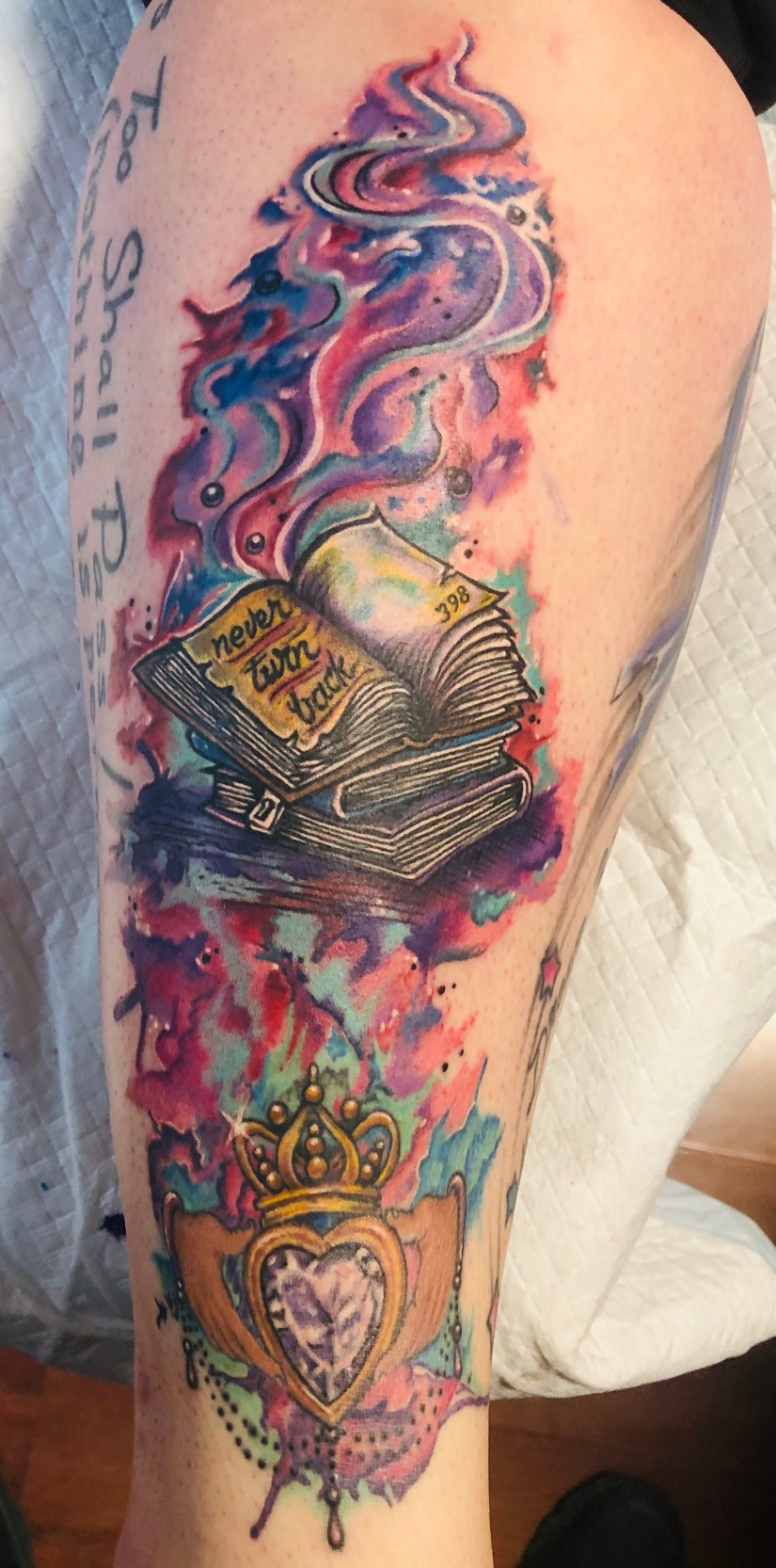 The books are because I will forever be a writer, even if the world stops reading. The page number, 398, is my highest weight. “Never turn back” is a constant reminder that I never want to go back to living such an unhealthy life. And the water color surrounding it is to remind me that my life is the “fairytale” I choose it to be; I determine my happiness. Thank you to Angel at Thunder Tats for making my vision so much better than I could have ever imagined! 🖤 (the claddagh is another tattoo that Angel did a few months back)