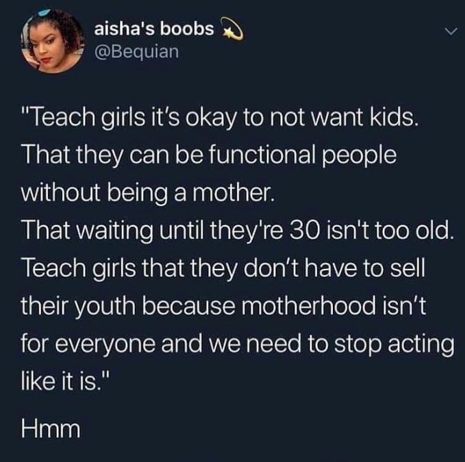 Now that I got most of that out of my system I also need to just say that people need to be empathetic to the fact that some people do want children but can not have them due to a thousand different reasons that are NO ONE else’s business. While this personally is not my case; when someone approaches me and tells me all about why I need to have babies they do not have my medical chart in front of them. & if it is some one who wants children but is struggling to conceive or can’t conceive or what ever else they have going on- those kind of statements can cut so deep into a person. I know, the intent isn’t there to hurt them, but I’m am sure it still hurts beyond belief.