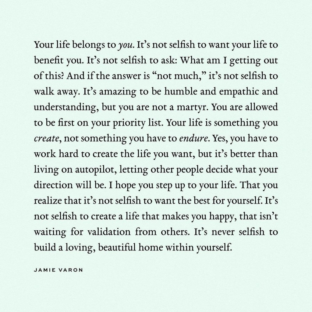 So your spouse doesn’t enjoy the same activities you do; do them anyway! You want to go on a hike on a beautiful sunny day, suggest it to your friends and goooo! Your friends are all busy and you want to go to the movies; get yourself the ticket and sit front row! You enjoy writing but aren’t sure if anyone reads it or enjoys it (🙋♀️) ; write that poem, short story, blog post anyway. You want to set a goal and crush it to feel better about yourself but feel like you’re met with naysayers and negativity; do the damn thing FOR YOU. You want to travel but your spouse doesn’t; plan a trip with friends and don’t give a single shit if you’re the third wheel.